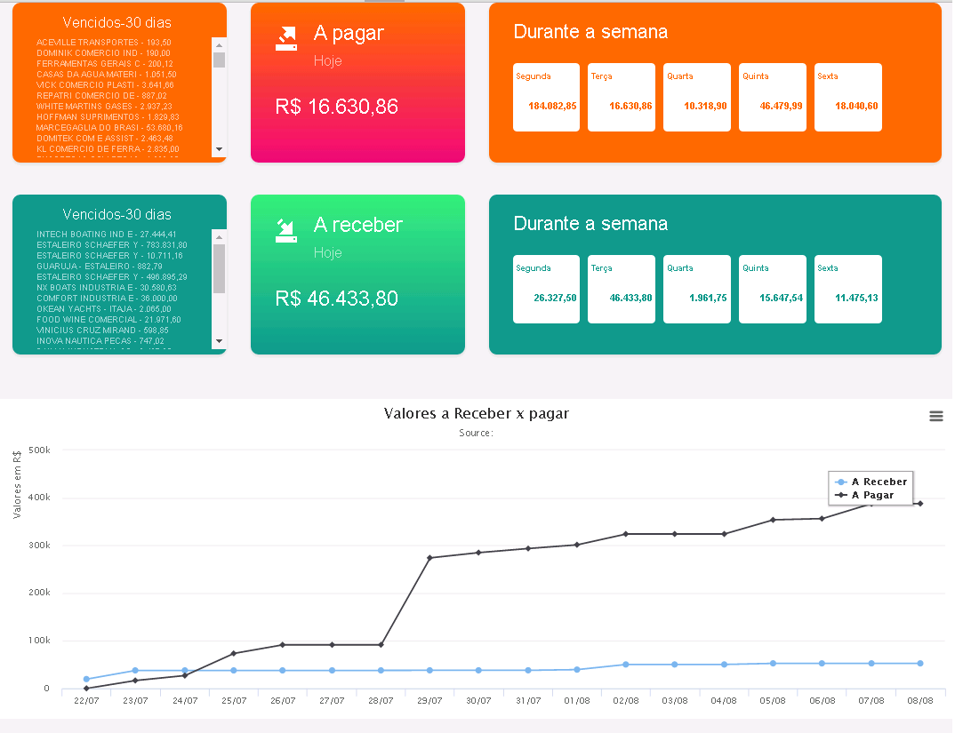 Dashboard das vendas, metas, receitas e fluxo de caixa;